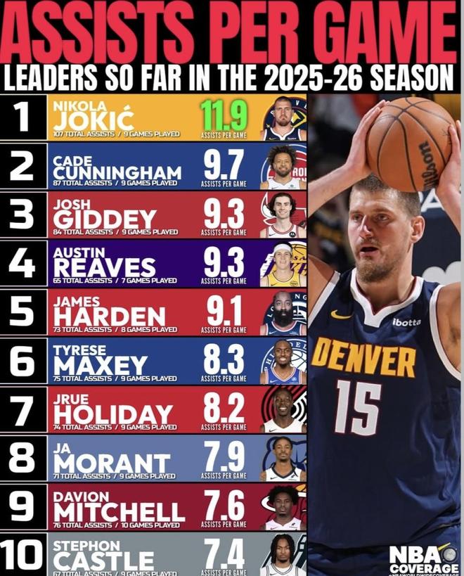 美国媒体nba worldwidecoverage晒出了2025-2026赛季至今的场均助攻榜单,约基奇、高居榜首,场均11.9次助攻,把队友都“喂饱”了。坎宁安、吉迪、里夫斯、哈登等后面一长串组织核心也都上榜,分布在东西部多支球队。