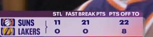 毫无活力,三节战罢湖人快攻得分0-21落后太阳,抢断0-11